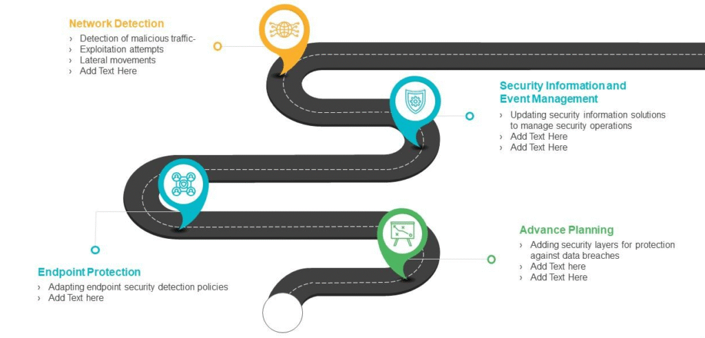Gelişmiş planlama, uç nokta koruması, güvenlik bilgisi ve olay yönetimi ve ağ algılamayı gösteren siber güvenlik kurumsal strateji yol haritasını sizlere sunuyoruz. Bu, sürecin dört aşaması hakkında ayrıntılı danışmanlık sağlıyoruz. Ağ Algılama, Uç Nokta Koruması, Gelişmiş Planlama, Güvenlik Bilgileri hakkında bilgiler bu yol haritasında bir plan ile sağlanıyor.